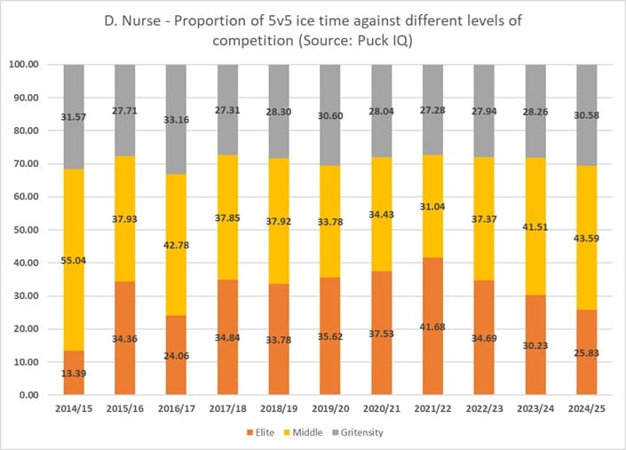 The table below shows a steady decline in Nurse’s proportion of ice time against elite-level competition (orange bars) throughout his career, as he was over 40 percent just three seasons ago. The 25 percent proportion he has this season would be one of the lowest in his career, indicating that the coaching staff is well aware of his deficiencies, and are actively trying to put him in a position to succeed.
