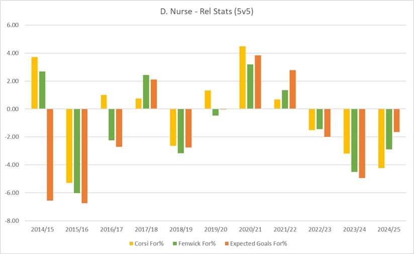 Below are Nurse’s relative-to-team shot-differential numbers by season. I tend to use Corsi, a proxy for puck possession, and Fenwick and Expected goals as a proxy for scoring chances.