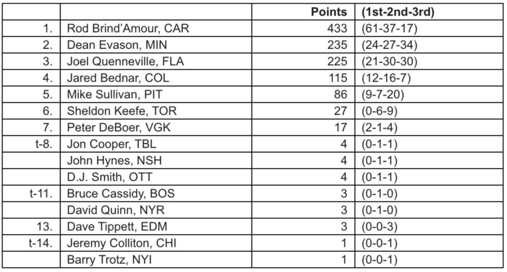 Brind’Amour won by a wide margin, receiving 61 first-place votes out of the 129 ballots cast. In second and third were Dean Evason and Joel Quenneville, who helped the Minnesota Wild and Florida Panthers to much better seasons in 2021 than they had in 2019-20.