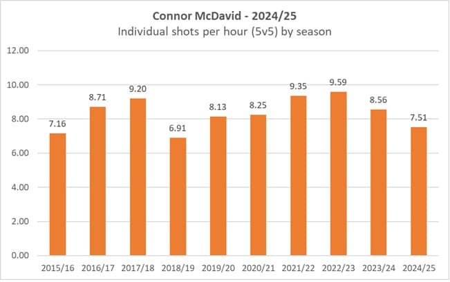 Ideally, the shots are coming from the forwards up front, especially from the top-end players. It’s worth noting too that McDavid’s rate of shots are down this season, which is a little baffling considering his talent level and above-average shooting percentage. His current individual rate of 7.51 shots per hour is down 22.1 percent when compared to his rate over the last three seasons (9.17 shots per hour). Unclear if it’s because the defencemen are taking more of the shots or if he’s dealing with something else.