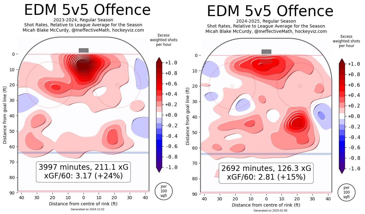 For additional context, below is a shot-location map from Hockey Viz comparing the Oilers’ chances last season compared to this season. Red indicates a higher volume relative to league average levels. What stands out here is the growth in chances coming from the blueline on the right side. And fewer shots from in close, which the Oilers excelled at last season.