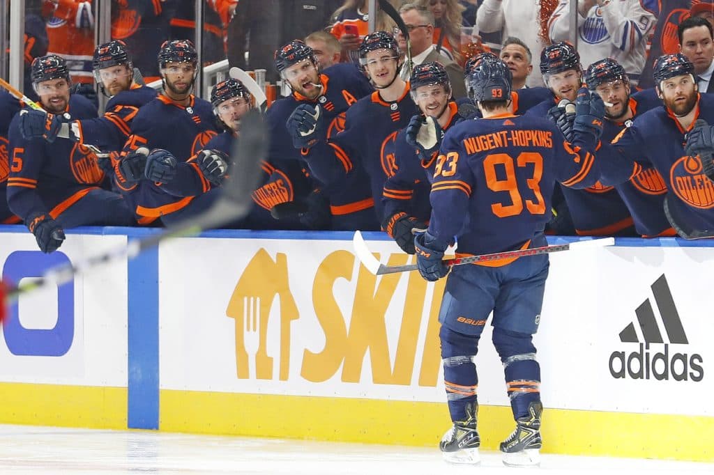 May 24, 2022; Edmonton, Alberta, CAN;The Edmonton Oilers celebrate a goal by forward Ryan Nugent-Hopkins (93) against the Calgary Flames during the first period in game four of the second round of the 2022 Stanley Cup Playoffs at Rogers Place. Mandatory Credit: Perry Nelson-USA TODAY Sports