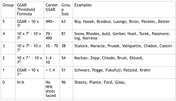 The threshold formula used was exponential due to the regularity of group size that resulted. The cohort of NHL goaltenders drafted had 357 members, and each threshold resulted in a grouping between 38 and 81 goalies for those that made it to the NHL. This seemed reasonable for the purposes of the model.