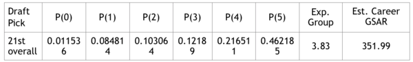 The model used Draft Slot as a predictor of the Career GSAR Group, and produced probabilities for a pick in each draft slot resulting in a goaltender of a given group. For example, a goaltender selected with the 21st overall pick has the shown probabilities of resulting in each stratified group: