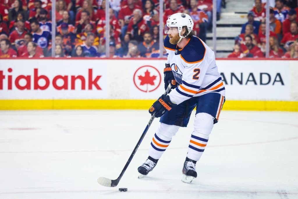 May 26, 2022; Calgary, Alberta, CAN; Edmonton Oilers defenseman Duncan Keith (2) controls the puck against the Calgary Flames during the first period in game five of the second round of the 2022 Stanley Cup Playoffs at Scotiabank Saddledome. Mandatory Credit: Sergei Belski-USA TODAY Sports