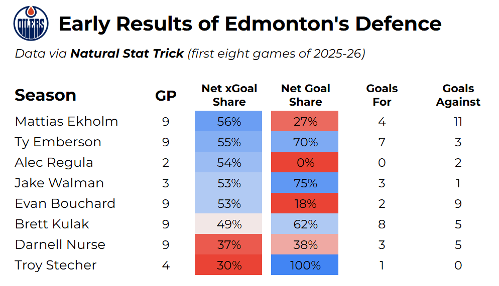 It is obviously a small sample, but so far, the Nurse pairing has already seen a drastic improvement next to Jake Walman. The two have out-scored opponents 2 to 1 alongside a 52 percent xG%. Note that in 105 minutes last season in 2024-25, Nurse and Walman had an excellent 61 percent expected goal share, out-scoring opponents 8 to 2. Again, another small sample, but another reason to believe that Nurse and Walman could form a very solid second-pair as they build chemistry and consistency over a larger sample. Even on paper, the two defenders are a good stylistic match, as Walman’s excellent puck-moving has already been incredibly beneficial for Nurse, who historically struggles when he is the primary puck-mover on his pair.