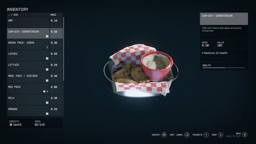 Oddly enough, that’s not the only time Edmonton is brought up in Starfield. There’s a meal called the ‘CAN-UCK – EDMONTONIAN’ which is labelled for brand pierogies and gravy, uncanned.