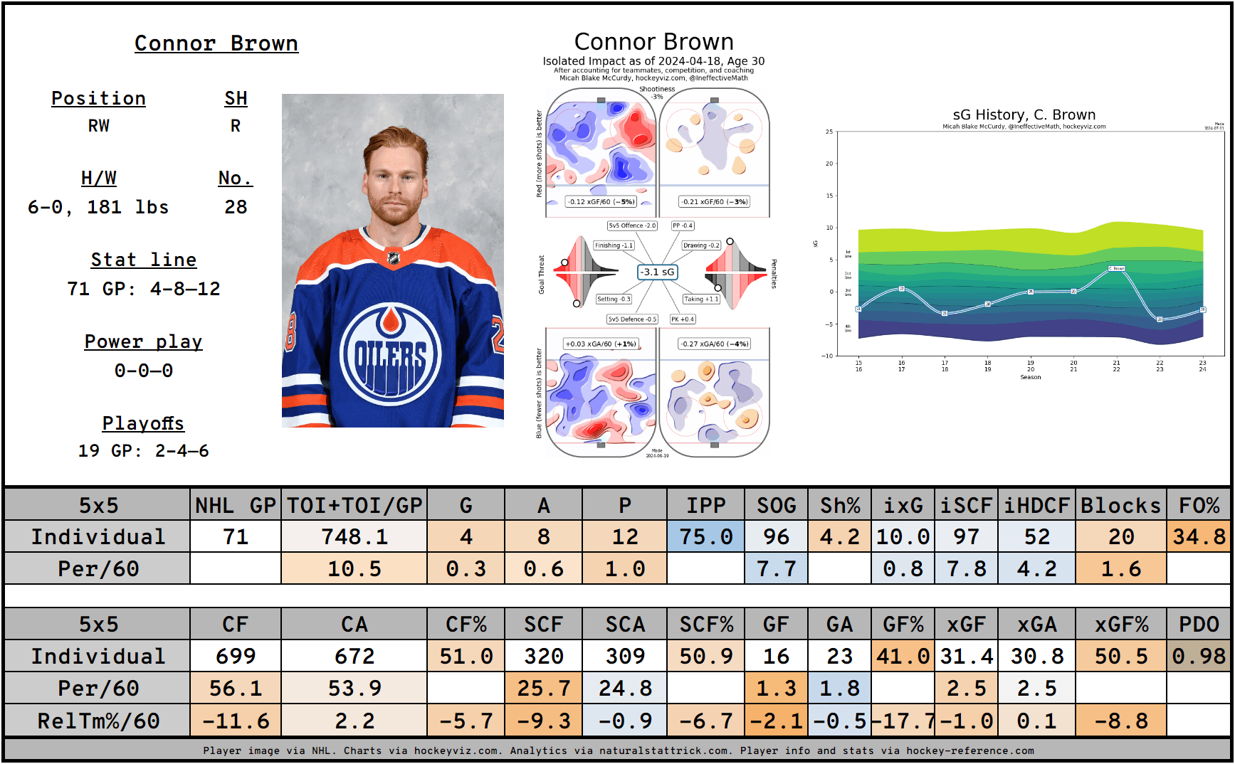 While the offence didn’t come for most of the season, Brown remained an effective player for the Oilers. With him on the ice, the Oilers choked out opposing offences, allowing just 1.8 goals against per hour at 5v5, and 24.8 scoring chances against per hour. Those were among the best numbers on the team last year.
