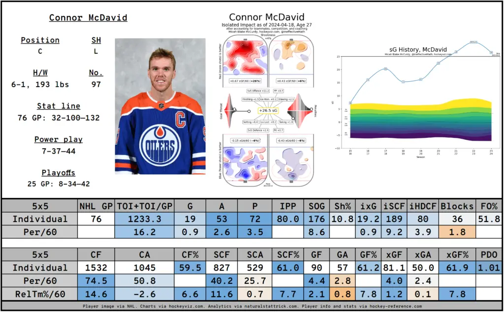 McDavid continued to be a huge driver of play, with excellent underlying numbers. According to Hockey Viz, he drove offence at a 26 percent rate above league average, defence at a six percent rate above league average while contributing on both the power play and penalty kill, both at six percent rates above league average. His contributions continue to break the Hockey Viz charts, with this past season seeing him contribute at five time the rate of an average first-line player.