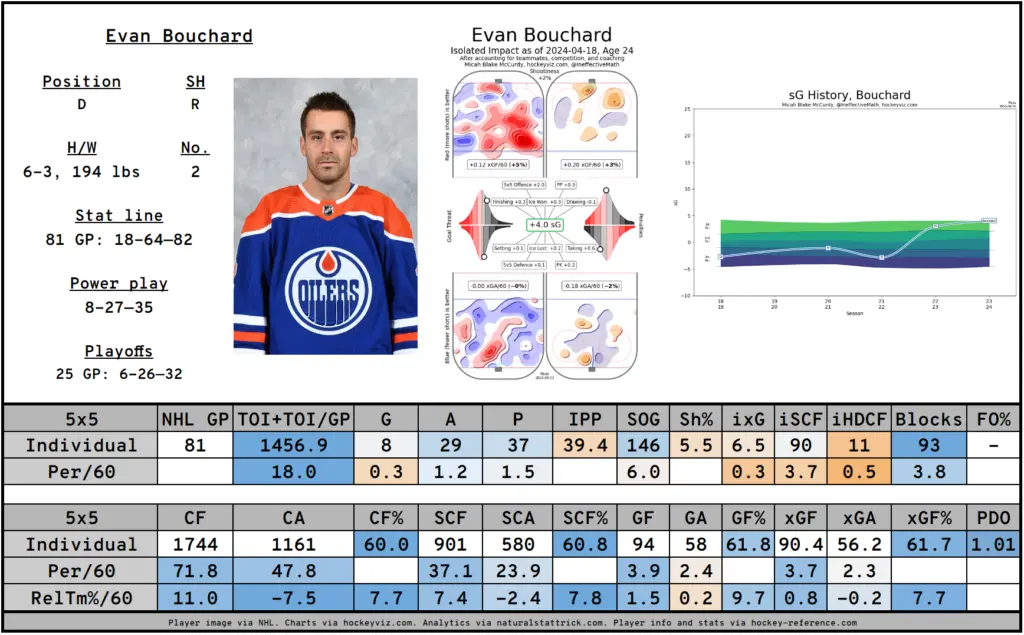 His impacts on the game are significant. He drove play last year at a five percent rate above league average, and defence at a league average rate, with his power play and penalty kill work being three percent, and two percent above league average, respectively, according to HockeyViz. And for the second straight year, those impacts make him a top-pairing defenceman in the NHL.