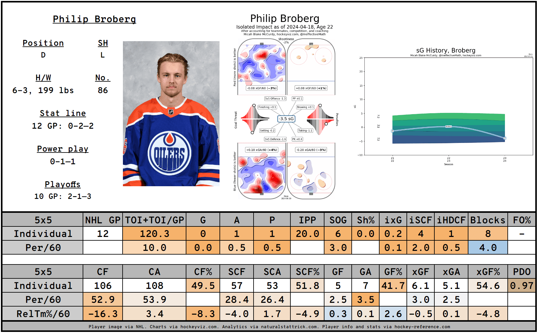 Broberg excelled, scoring two goals and three points and looking comfortable in 10 games as the Oilers ran hot with him on the ice. While not reflected above, the Oilers controlled 42.41 percent of the shot attempt share, 34.87 percent of the expected goal share, 37.39 percent of the scoring chance share, but a staggering 75 percent of the goal share, outscoring the opposition 6-2. All in all? He had a 5v5 playoff PDO of 1.101, a very high number.