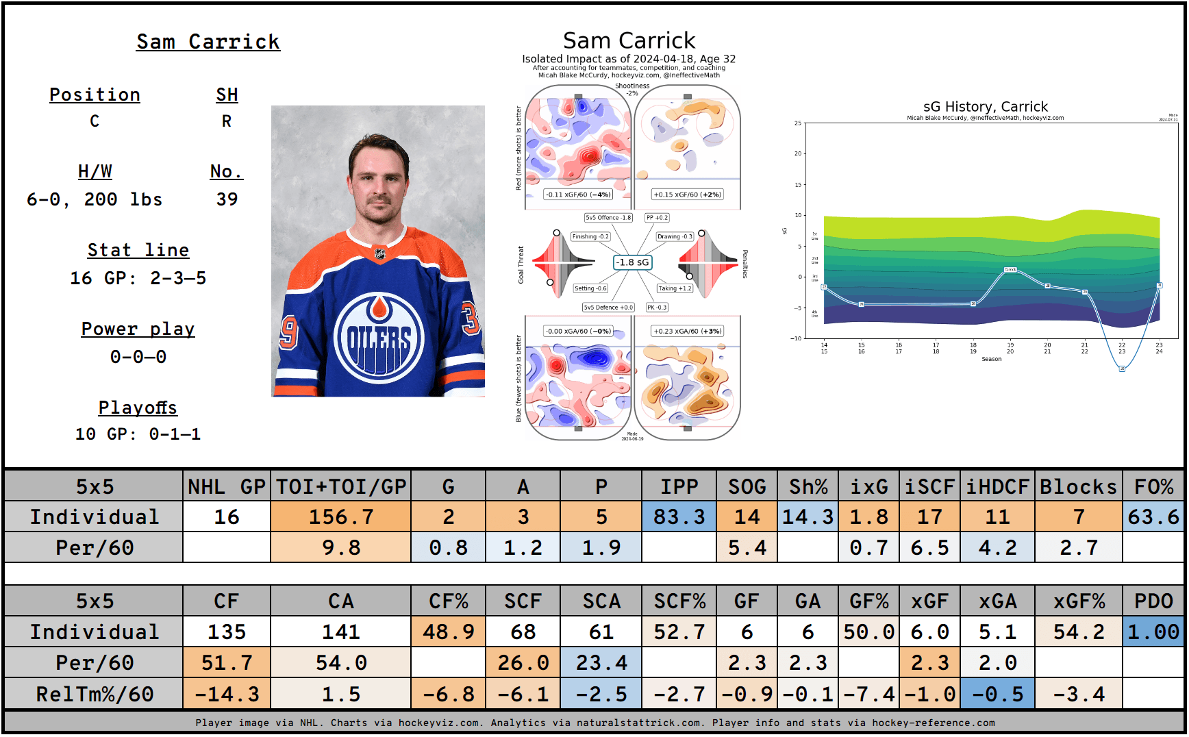 While not represented by my chart above, he was a physical presence for the team, laying 11.49 hits per hour in the regular season, and 20.95 in the playoffs. Carrick was strong in the faceoff circle for the Oilers, which was needed as a right-shot centre. He had a 63.6 percent win percentage in the regular season, and a 56.32 percent rate in the playoffs, the highest among all players.