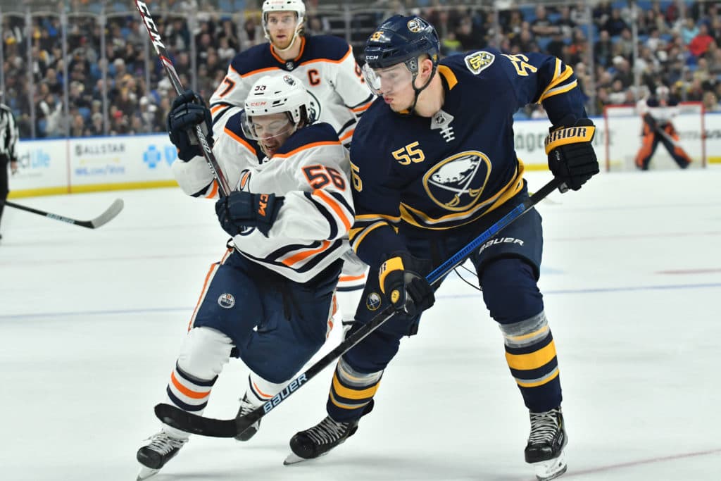 Jan 2, 2020; Buffalo, New York, USA; Edmonton Oilers right wing Kailer Yamamoto (56) checks Buffalo Sabres defenseman Rasmus Ristolainen (55) in the third period at KeyBank Center. Mandatory Credit: Mark Konezny-USA TODAY Sports