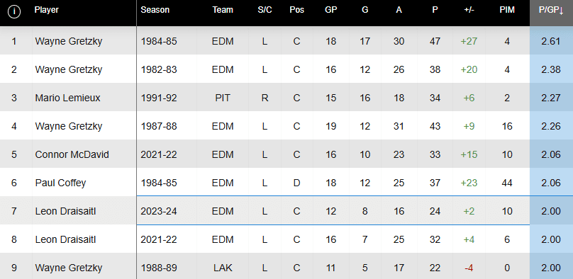 — Draisaitl is averaging 2.00 points a game this season. Prior to this season, he was one of only eight players (minimum 10 GP) to average two points/game in a playoff year.