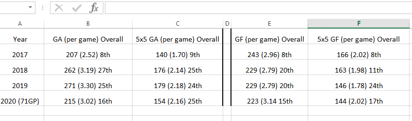 The Oilers, as a team, need to improve their play defensively at 5×5. I don’t believe the Oilers defence is solely to blame, far from it, but it is clear based on the numbers below the team has not improved defensively at 5×5 over the past three seasons. And they’ve had five of the same D-men over that span. I believe as a group, they don’t mix well. They need different elements spread across the three pairs. Holland needs to switch up the D corps.