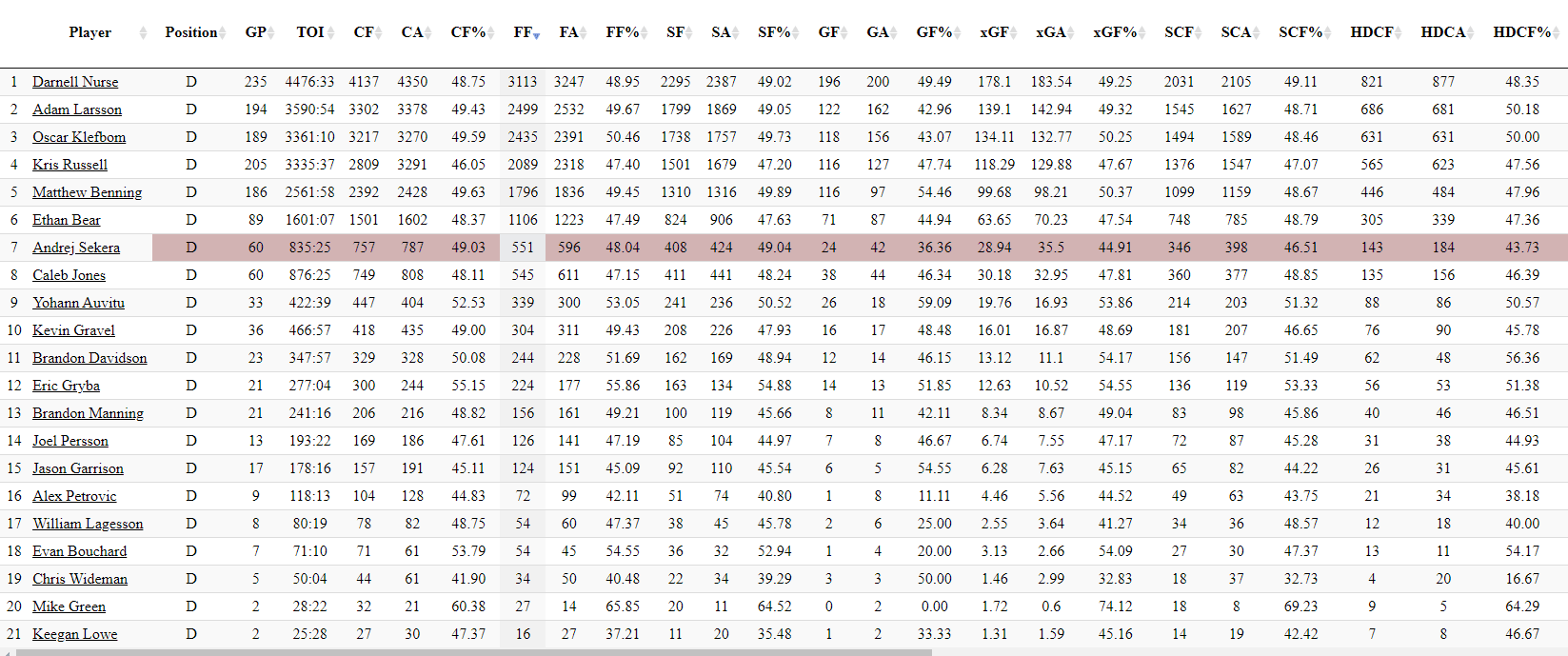 There isn’t much difference, stats-wise, between Nurse and Klefbom, except their GF%, where Nurse is at 49% and Klefbom is at 43%. If you are wondering, Nurse has played 38% of his 5×5 minutes in that span with McDavid, while Klefbom skated 34% of his with McDavid. I recognize Matt Benning has mainly played in a third pairing role, but you can’t ignore how he is consistently on the ice for more goals for than against. He is a solid third pair defender. If you play him with a speedy left defender — Caleb Jones perhaps — they’d complement each other quite well.