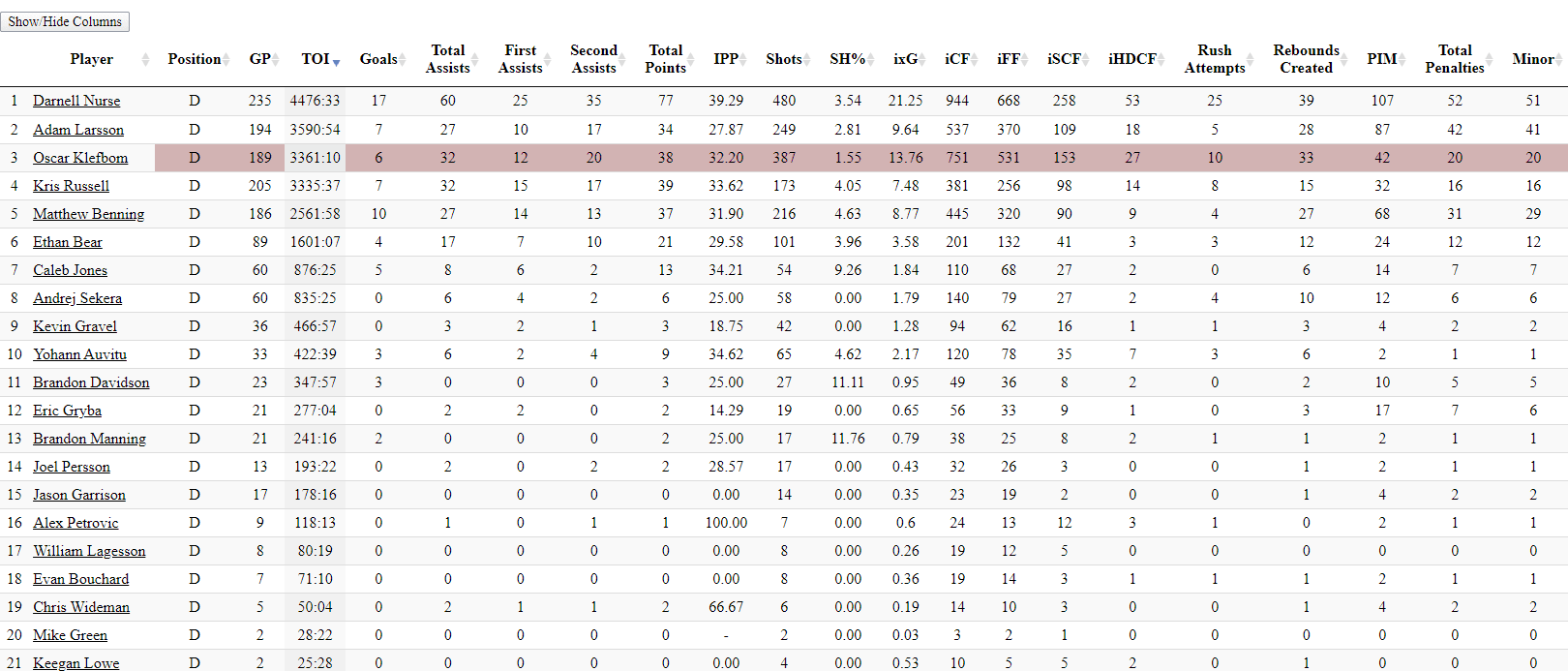 I don’t understand all the anger directed towards Darnell Nurse. He isn’t a #1 defender, but he has never been paid like one. Much of the anger doesn’t match the results. He doesn’t bring enough offence, critics say. But at 5×5 he has the ninth most points in the NHL among D-men the past two seasons. And that is on a team that is 24th in 5×5 goals the past two seasons. Nurse is not a dangler, or a dynamic player inside the offensive blueline, but he is the best transporter on the blueline and his speed creates offence.