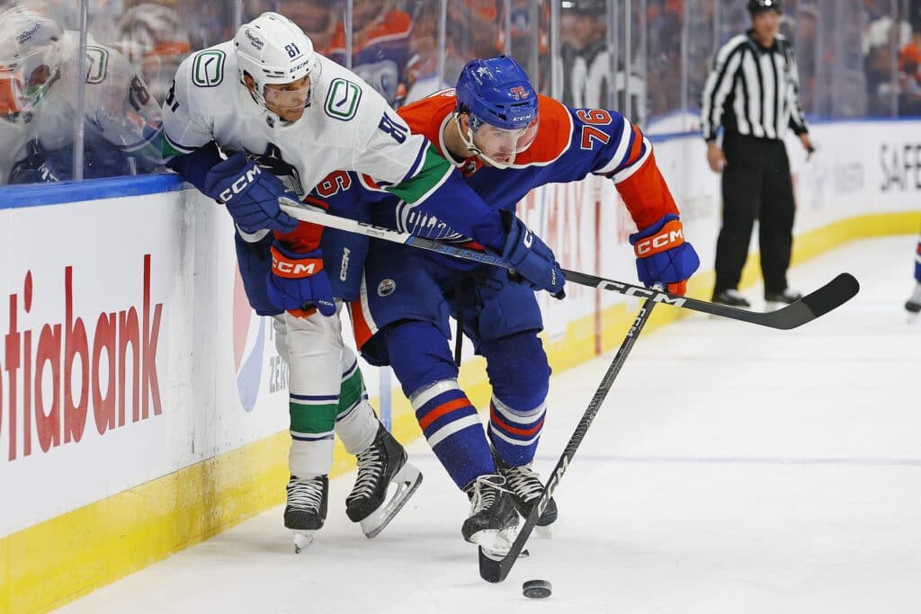 Sep 27, 2023; Edmonton, Alberta, CAN; Edmonton Oilers defensemen Phil Kemp (76) and Vancouver Canucks forward Dakota Joshua (81) battle for a loose puck during the second period at Rogers Place. Mandatory Credit: Perry Nelson-USA TODAY Sports