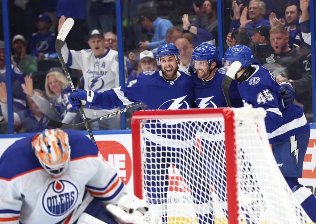 Nov 18, 2023; Tampa, Florida, USA; Tampa Bay Lightning center Luke Glendening (11) is congratulated after he scored goal against the Edmonton Oilers during the third period at Amalie Arena. Mandatory Credit: Kim Klement Neitzel-USA TODAY Sports