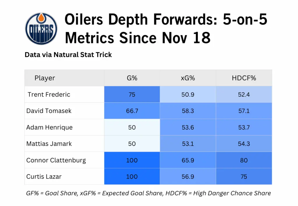 On Nov. 17, following an ugly loss to Buffalo, the depth numbers looked catastrophic. At 5-on-5 without McDavid and Draisaitl, the Oilers were a jaw-dropping minus-21. Even by Edmonton’s standards, that level of dependency was unprecedented.