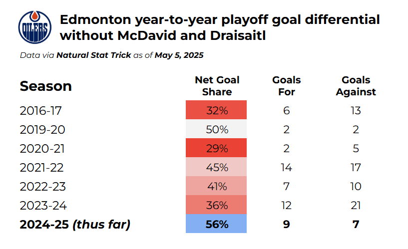For the Oilers, they’ve had quite some trouble reaching that mark. In fact, up until this year, they had never out-scored opponents without McDavid and Draisaitl on ice in the playoffs, with their depth goal differential often hovering around ~40 percent. Last year in particular, they managed to end the playoffs at a ghastly 36 percent. Edmonton’s star players and historic PK may have managed to get them all the way to Game 7 of the finals, but simply put, it will be very difficult for them to reach that far again with a bottom-six performing at that level.