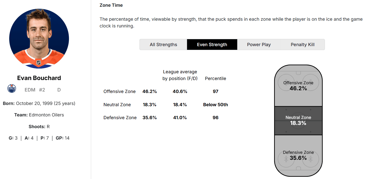 Combined, all of these attributes result in the Oilers spending significantly more time in the offensive zone with Bouchard on-ice, which in turn leads to less time in the defensive zone, and consequently, fewer goals and chances against.