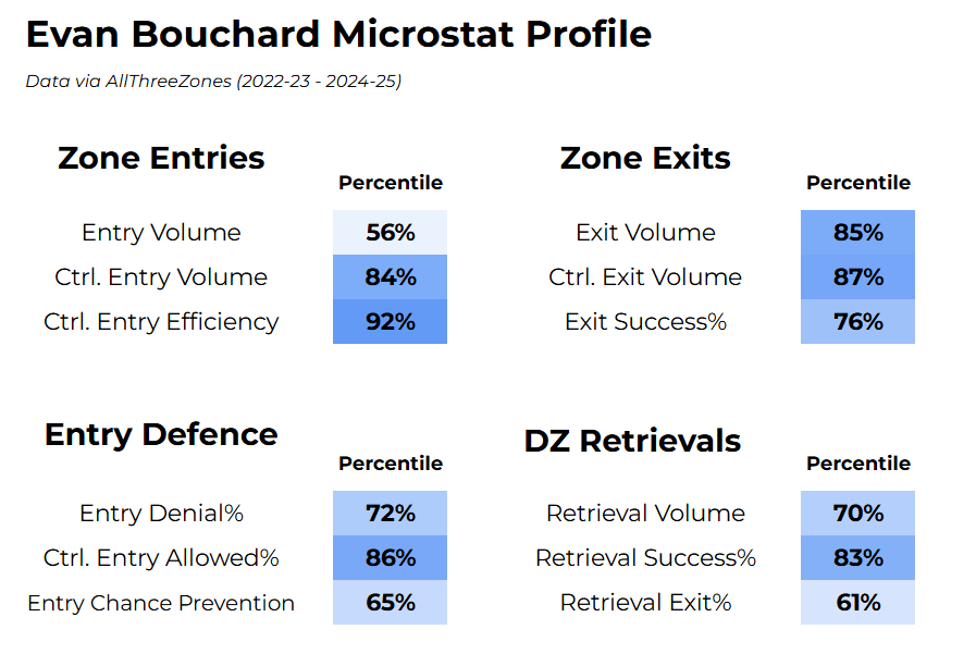 You’ll notice that Bouchard ranks exceptionally well in essentially every stat here, from zone entries and exits, to entry defence and puck retrievals. But what do zone entries and zone exits have to do with defence, you may ask?
