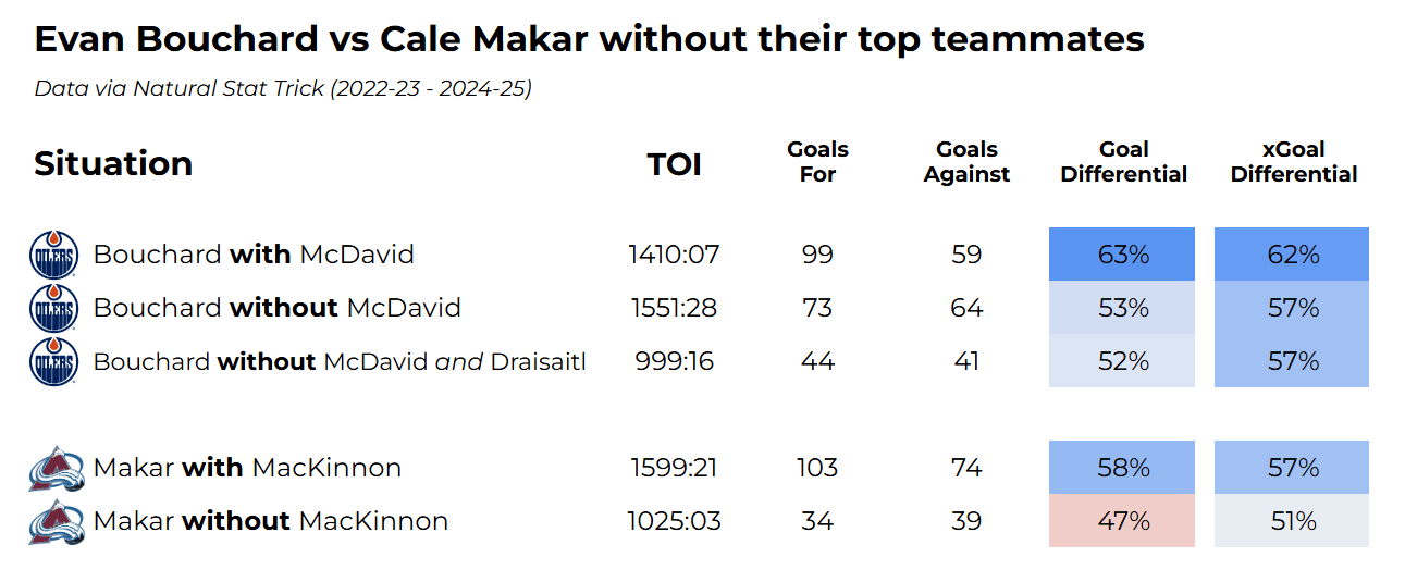 Now, I’m not implying Bouchard is better than Makar; rather, Makar’s results here are used as a reference for the point that I’m making, which is that Bouchard continues to drive excellent two-way results with or without Edmonton’s stars.