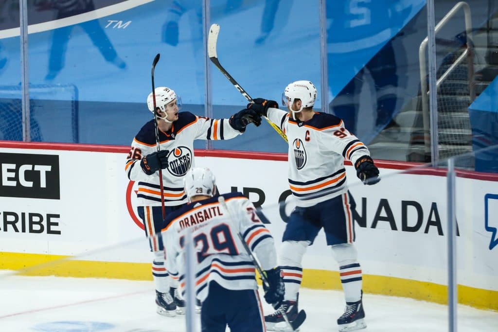 Jan 24, 2021; Winnipeg, Manitoba, CAN; Edmonton Oilers forward Kailer Yamamoto (56) is congratulated by Edmonton Oilers forward Connor McDavid (97) on his goal against the Winnipeg Jets during the third period at Bell MTS Place. Mandatory Credit: Terrence Lee-USA TODAY Sports