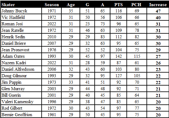 A 20-30-point increase over a previous career best at age 29 is rare. Here is the list of players who at age 29+ surpassed their previous career-best by 20 or more points. (I only included players whose original career high was 60+ points).