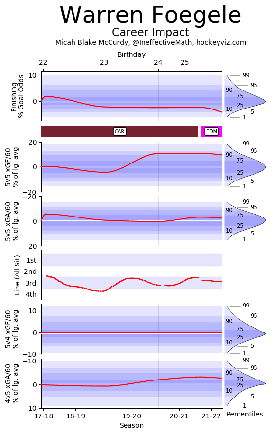 At even-strength, Foegele is providing offence at a 10 percent rate above league average, and defence at a three percent rate above league average. These are strong numbers for any player, let alone one who has been in an Oilers bottom-six that has been caved in this season. Arguably the most impressive part is that his numbers have remained stable from his time in Carolina.