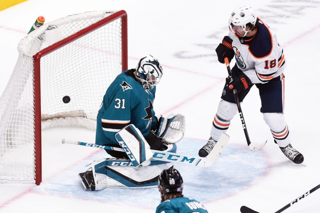 Nov 19, 2019; San Jose, CA, USA; Edmonton Oilers left wing James Neal (18) scores a goal past San Jose Sharks goalie Martin Jones (31) during the second period at SAP Center in San Jose. Mandatory Credit: Cody Glenn-USA TODAY Sports