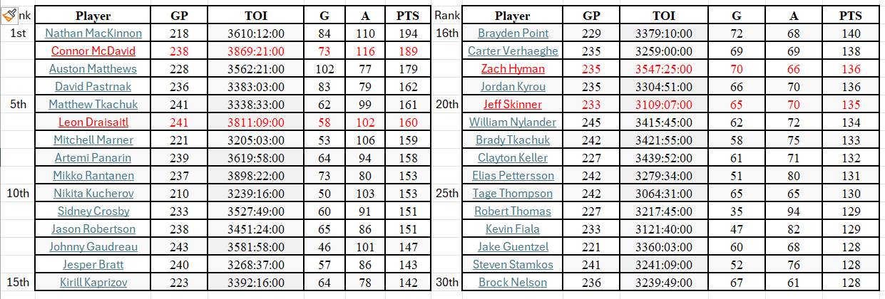 McDavid (189), Draisaitl (160), Hyman (136) and Skinner (135) have been excellent producing points 5×5 the past three seasons, and having a duo on each line, in theory, should give the Oilers an excellent 1-2 punch.