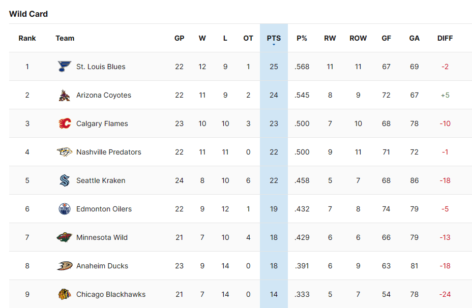 They are five points out of the second wild card spot, with three teams ahead of them. And they likely will be further back when they return to action next Wednesday. Arizona (STL, WSH), Calgary (VAN, MIN), Minnesota (CHI, @ CGY) and Seattle (@OTT, @MTL) play twice while Nashville plays three times (NYR, @BUF, @CHI).
