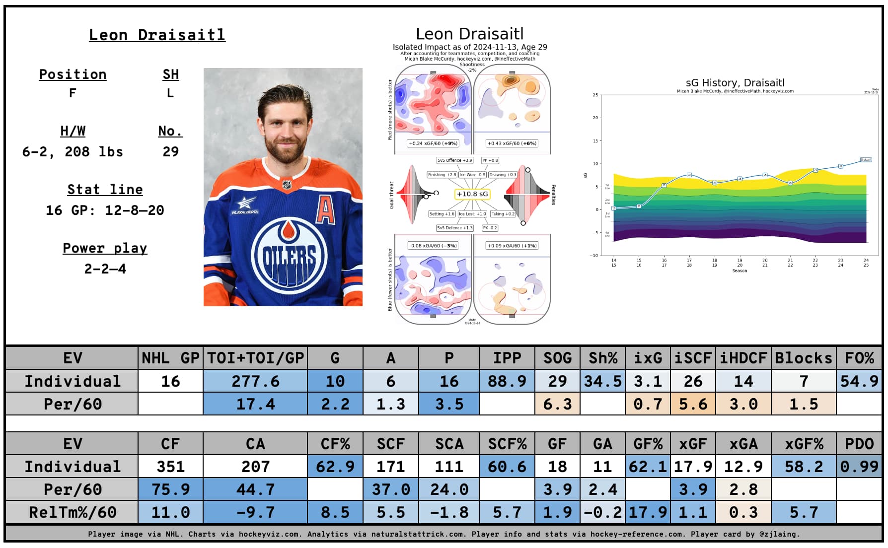 He sits tied for the lead league in goals, with a dozen and tied for eighth in the league in points, putting up 20 through the Oilers first 16 games. From an offensive standpoint, it’s been one of the best starts in his career, with only the starts of the 2019-20 season and 2021-22 season seeing him score more goals.