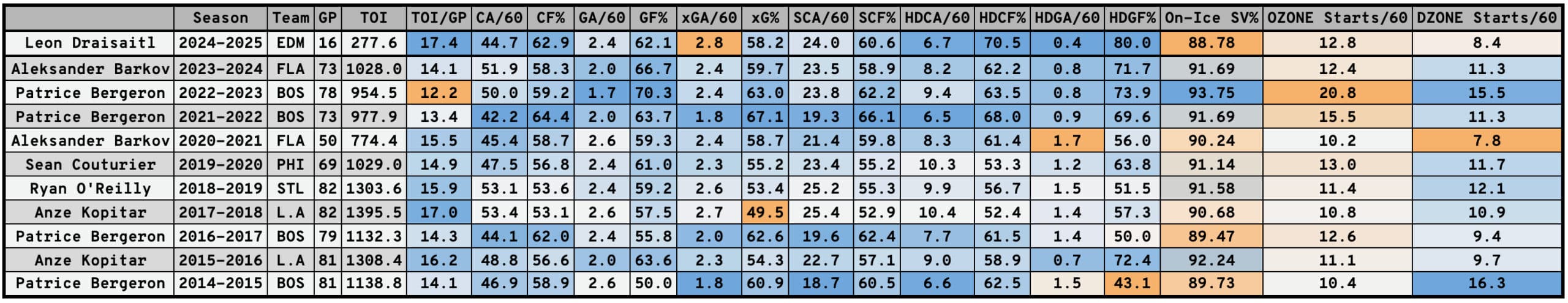 Before taking one step further, it’s critical to mention the sample size of Draisaitl’s 2024-25 season is incredibly small. We’re talking about 16 games here, so there’s lots of room for his numbers to change, but there’s reason to believe — based on some of the numbers the last 10 players who have won a Selke Trophy as the league’s best defensive forward had — that Draisaitl could be considered an early contender for this year’s award.