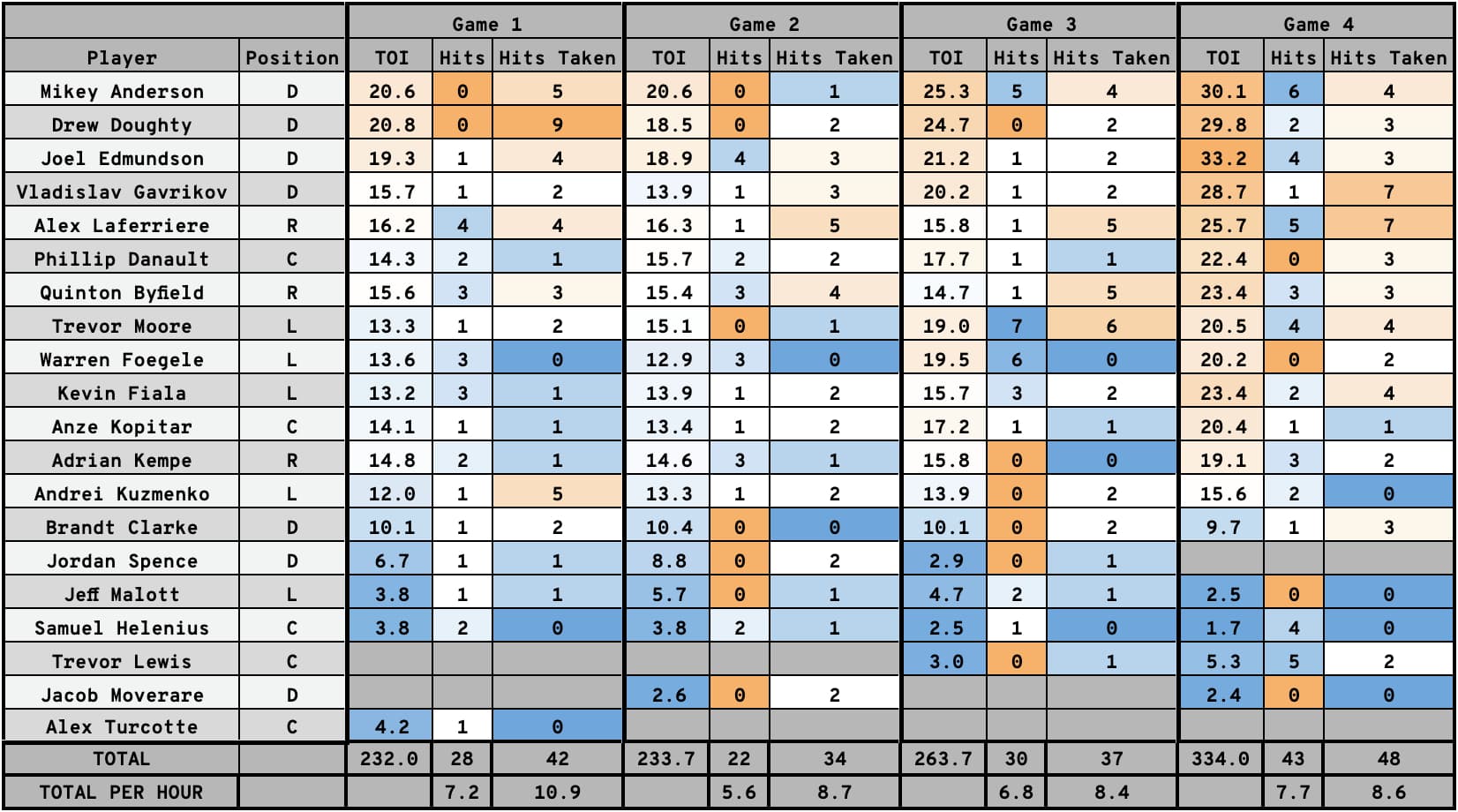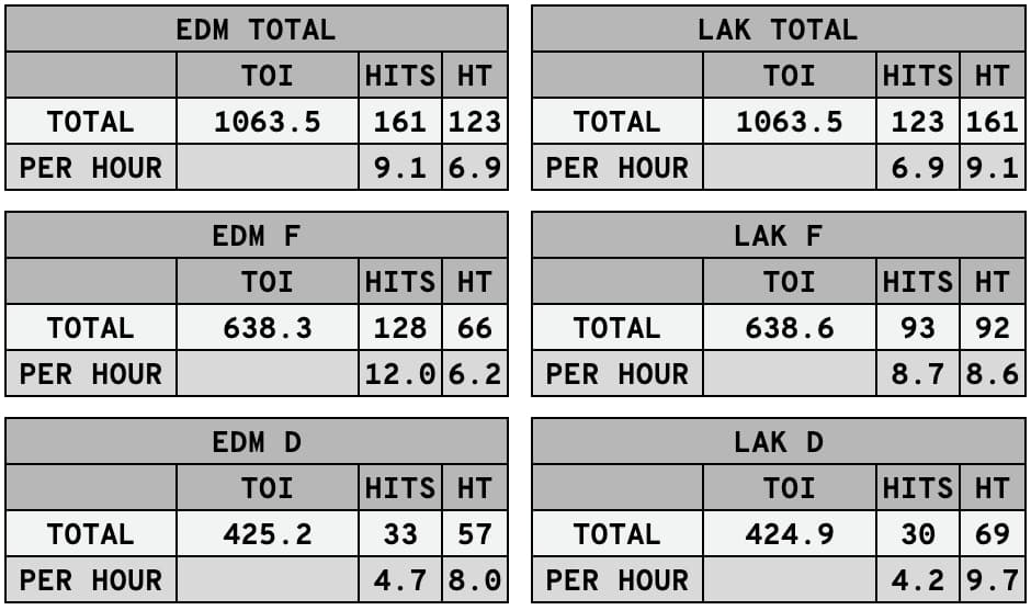 One other thing the Oilers began doing more was increasing their physicality on the Kings’ blueline at five-on-five. They brought a heavy physical game in Game 1, laying 23 hits on Kings defenceman — nine of which were on Doughty alone — or 14.8 per hour. In Games 2 and 3, they dipped to 13 hits in both games, 8.3 per hour in Game 2 and 7.5 in Game 3.