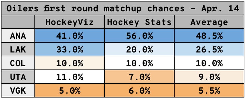 The Oilers have outside chances at playing the Colorado Avalanche, Utah Mammoth and Vegas Golden Knights, but both models see those are far less likely outcomes.
