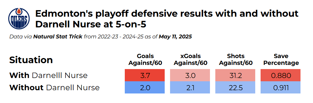Whether it’s goals, shots, or scoring chances, the Oilers are significantly better defensively without Nurse on-ice in the playoffs, to the point that Nurse has seemed to have a significant effect on Edmonton’s save percentage.