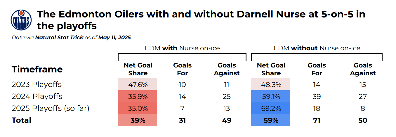 However, the Oilers’ goal share sees a whopping 20 percent decrease when Nurse steps on the ice. That’s a swing of 39 goals in 45 playoff games. Considering how small the margin for error is in the postseason, this is quite concerning.