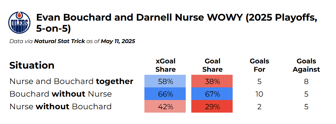 When Nurse’s underlying playoff metrics have been brought up in previous years, many have claimed that they are simply due to the lack of a proper defensive partner, as Nurse primarily played with Cody Ceci in the 2023 and 2024 playoffs. Though I would counter-argue that a defenceman of his cap-hit should be successful regardless of who he plays with, I can at least understand the rationale. Indeed, Nurse did not have a true top-four defensive partner in prior postseasons, and this has likely played a role in his results.