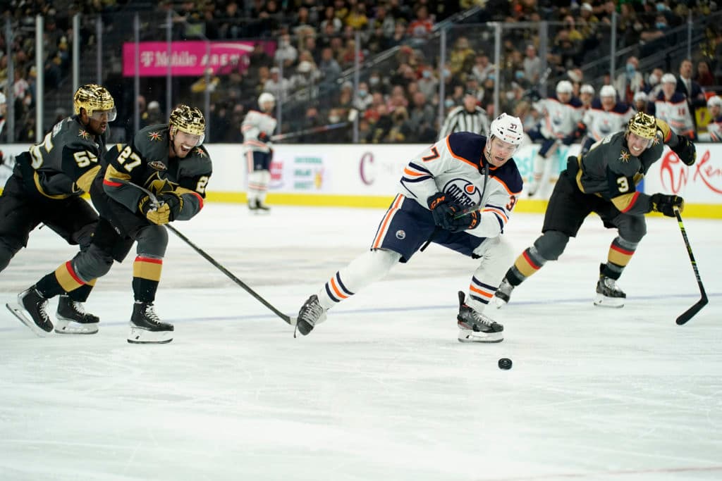 Oct 22, 2021; Las Vegas, Nevada, USA; Edmonton Oilers winger Warren Foegele (37) pushes the puck against Vegas Golden Knights right wing Keegan Kolesar (55) and defenseman Shea Theodore (27) and defenseman Brayden McNabb (3) in the third period at T-Mobile Arena. Mandatory Credit: Lucas Peltier-USA TODAY Sports