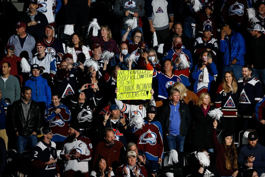 May 31, 2022; Denver, Colorado, USA; Edmonton Oilers fans hold up a sign before the game against the Colorado Avalanche in game one of the Western Conference Final of the 2022 Stanley Cup Playoffs at Ball Arena. Mandatory Credit: Isaiah J. Downing-USA TODAY Sports