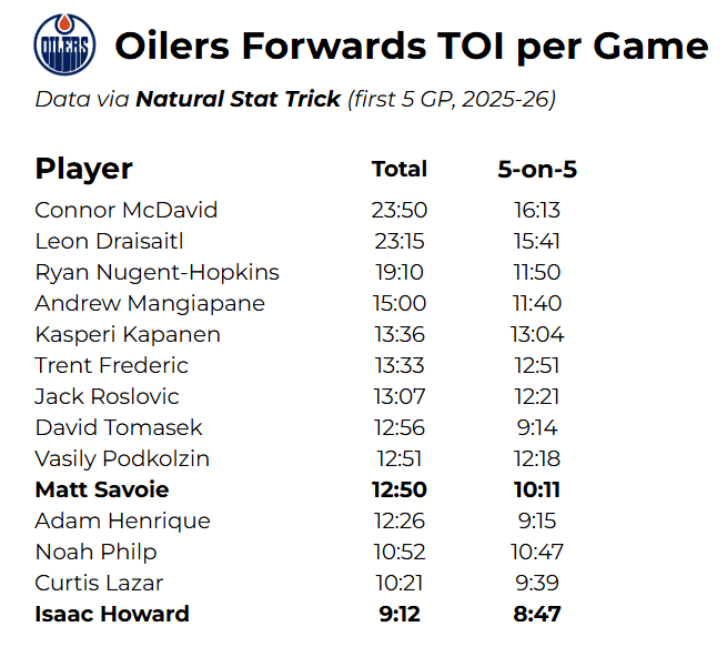 Thus far, the Oilers have struggled greatly to score at 5-on-5. Not one line combination has consistently stuck together and performed well. Connor McDavid and Leon Draisaitl are both already averaging over 23 minutes per game; note that they have never averaged more than 22 in a single season to date. And what’s just as concerning to me are the TOI totals for Savoie and Howard.