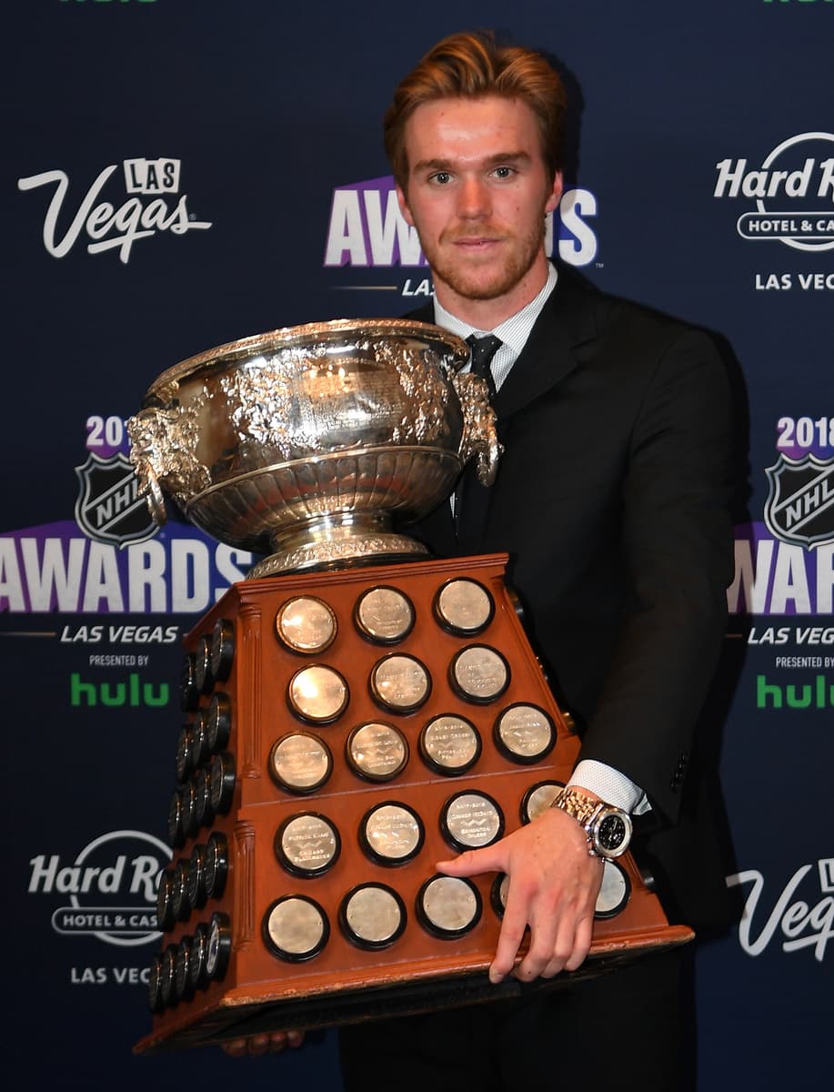 Jun 20, 2018; Las Vegas, NV, USA; Connor McDavid holds the Art Ross trophy during the 2018 NHL Awards at Hard Rock Hotel and Casino. Mandatory Credit: Stephen R. Sylvanie-USA TODAY Sports