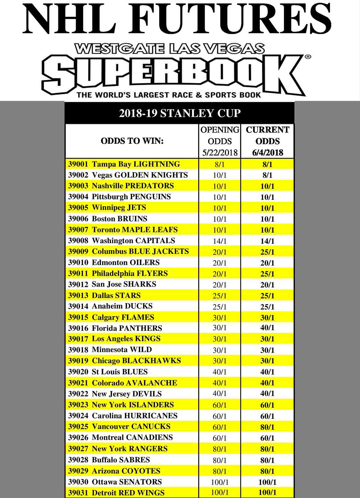Detroit Red Wings opening odds 2017: 100/1 2018: 100/1