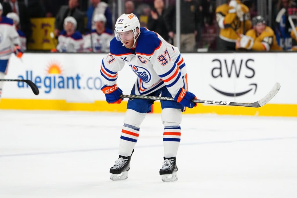 Dec 3, 2024; Las Vegas, Nevada, USA; Edmonton Oilers center Connor McDavid (97) awaits a face off against the Vegas Golden Knights during the third period at T-Mobile Arena. Mandatory Credit: Stephen R. Sylvanie-Imagn Images