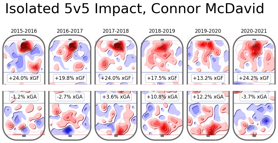 Other underlying numbers highlight this, too. According to hockeyviz.com, which analyzes isolated impacts of players, McDavid provided even-strength offence at a 24 percent rate above league average and defence at a four percent rate above league average. The offensive contributions are massive, but so are the defensive contributions.