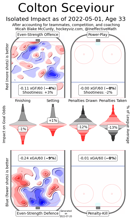 For Sceviour, his strengths lied in his ability to suppress opposing offences. His defensive shot attempt, scoring chance, and expected goal rates were all better than team average, but there was also an offensive blackhole with him on the ice and the Oilers mustered virtually nothing there this year with him on the ice.