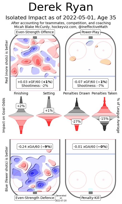 Circling back to the comment about his defensive play, what was really encouraging was Ryan’s isolated impact chart. It showed he actually was a really strong player in his own zone contributing defence at a nine percent rate above league average, while chipping in offence at a one percent rate above league average.